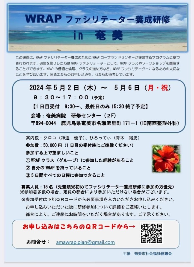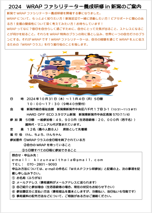 | 参加費 | 60,000円 経済的に困難のある方に奈良WRAPより25,000円の助成があります。ご相談ください。 |